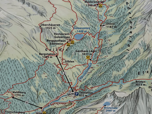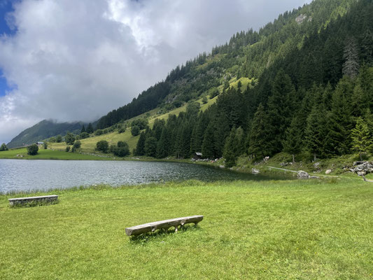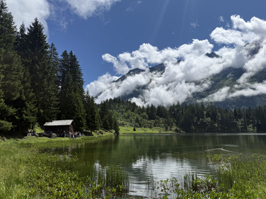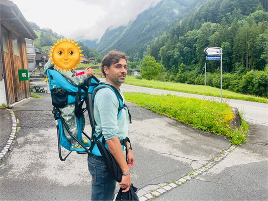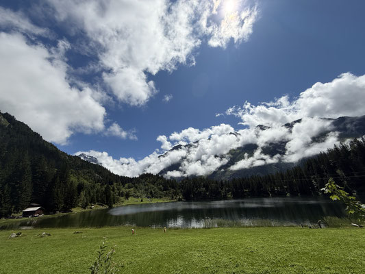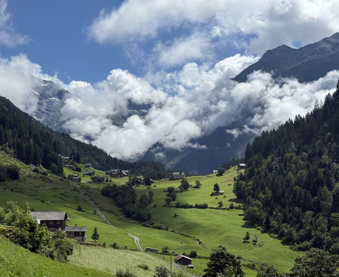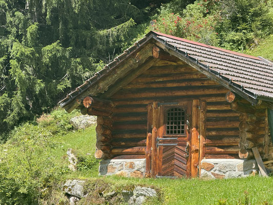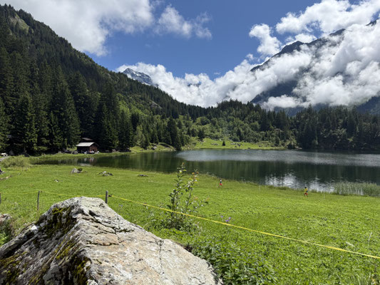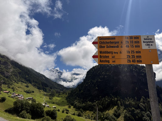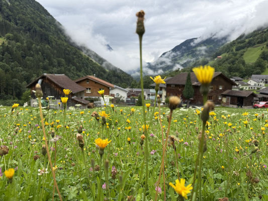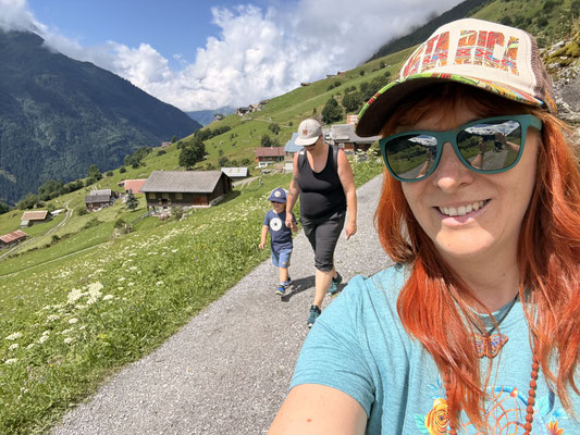 Alle Kinder sitzen in den Autos. Das Grillzeug ist eingekauft. Wir fahren durch das Tal und plötzlich geht es steil und eng den Berg hinauf … eine Kurve … noch eine … ein Tunnel … und schon sind wir in Bristen und ab geht`s in die Seilbahn nach Golzen. Es ist eine kleine Seilbahn, nicht viel größer als eine Telefonzelle … OBEN! Das hatte ich (Robin) mir gewünscht. Eine Bilderbuchlandschaft mit wundervollen Wiesen, Hütten und Höfen, eine kleine Kapelle erscheint im Hintergrund, die Wolken hängen in den Berggipfeln und wir schlendern los. Unser Ziel … ein wundervoller, idyllisch gelegener Bergsee. Ein paar Schweizer grillen Raclette-Käse und wir legen unsere Würstchen mit aufs Grillrost. Es ist ein entspannter Tag und auf dem Rückweg kaufen wir noch leckeren Alpkäse. Die Kuh dazu steht daneben. So muss es sein!